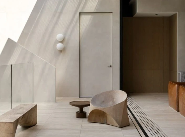 Soft neutral tones, natural oak finishes, and textural stone details define the interior — designed to evoke calm and sophistication.